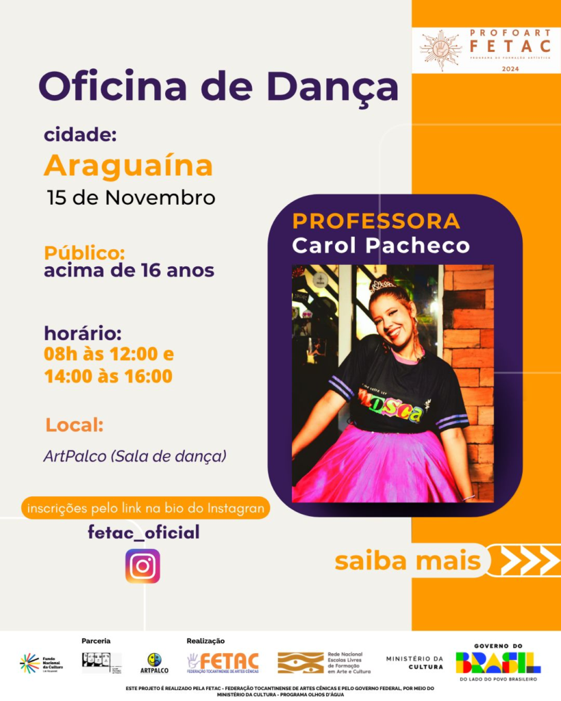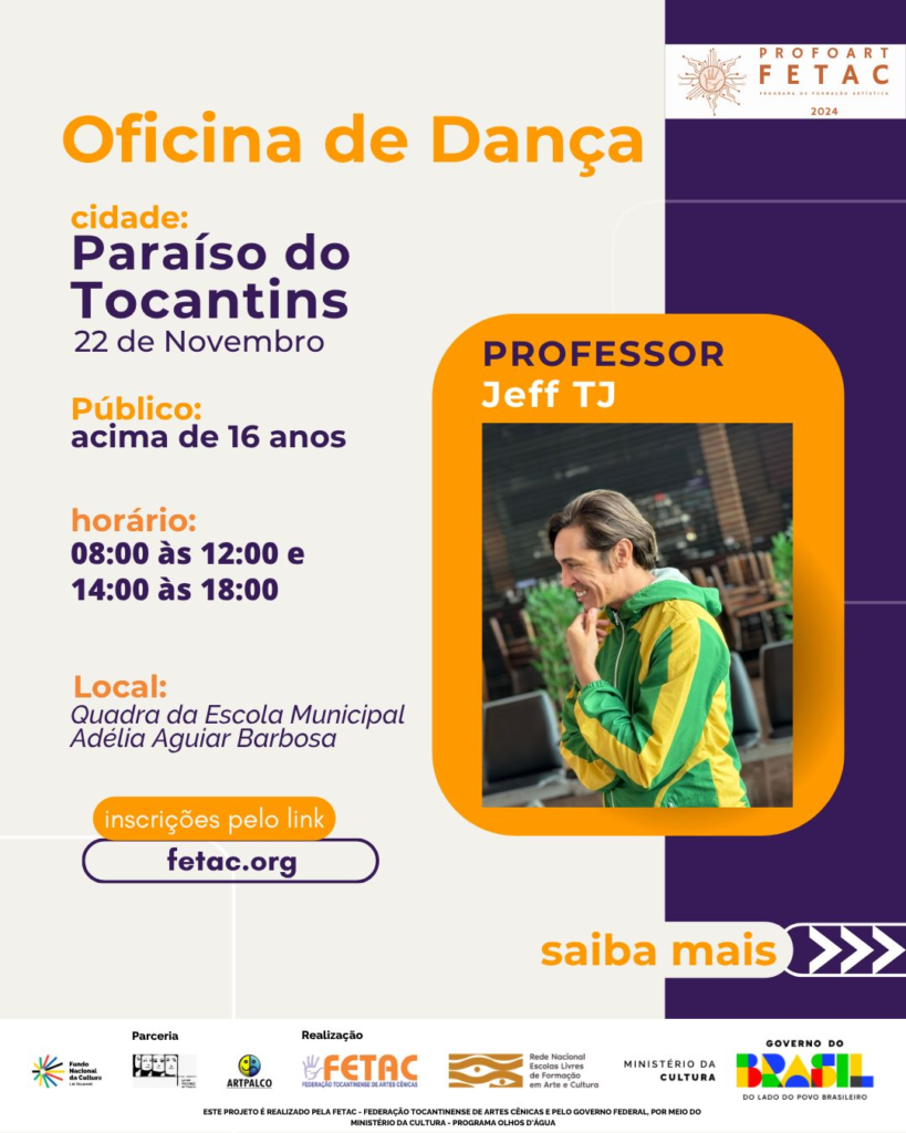 A FETAC – Federação Tocantinense de Artes Cênicas, em parceria com o Ministério da Cultura e o Programa Olhos d’Água, convida você para participar da Oficina de Dança com o professor Jeff TJ e professora Carol Pacheco uma experiência voltada para o corpo, a arte e a expressão.